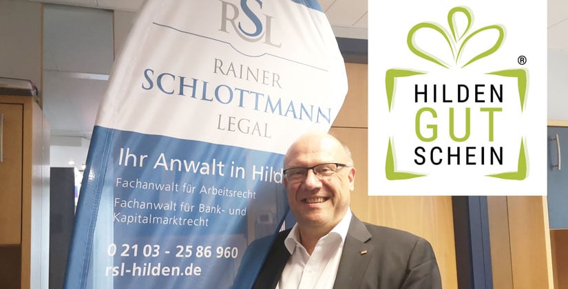 Erbrecht, Arbeitsrecht und Bankrecht – Mit der Rechtsanwaltskanzlei RSL Rainer Schlottmann in Hilden stehen Sie immer auf der rechtssicheren Seite. Für die Userinnen und User von anzeiger24.de verlost der Jura-Experte 5 Hilden-Gutscheine (Gesamtwert: 50 Euro), einlösbar bei rund 100 Geschäften, Restaurants und anderen Dienstleistern.