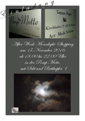 Die Pomp Motte in Hilden bietet am, 17.November 2016, von 18 bis 22 Uhr ein After Work Moonlight Shopping an. Es werden Sekt und Betthupfer´l gerreicht.